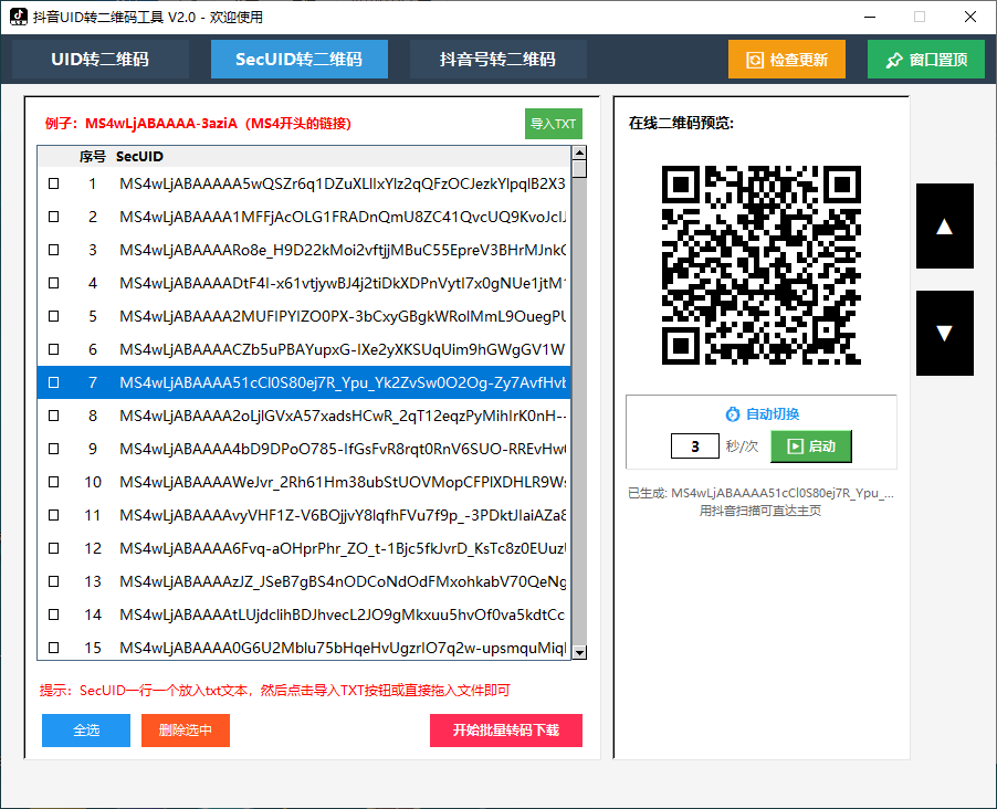 抖音uid批量转二维码永久卡 📦 库存 16 📈 销量 861 🤖 自动发货 ¥ 11.00 购买数量 优惠券 【更换】 使用 已优惠金额:0.00元 联系方式 选择支付方式 推荐支付宝支付 支付宝备用支付通道1 余额支付 抖音app扫码直接跳转用户主页 实时显示二维码 新增功能定时自动跳转