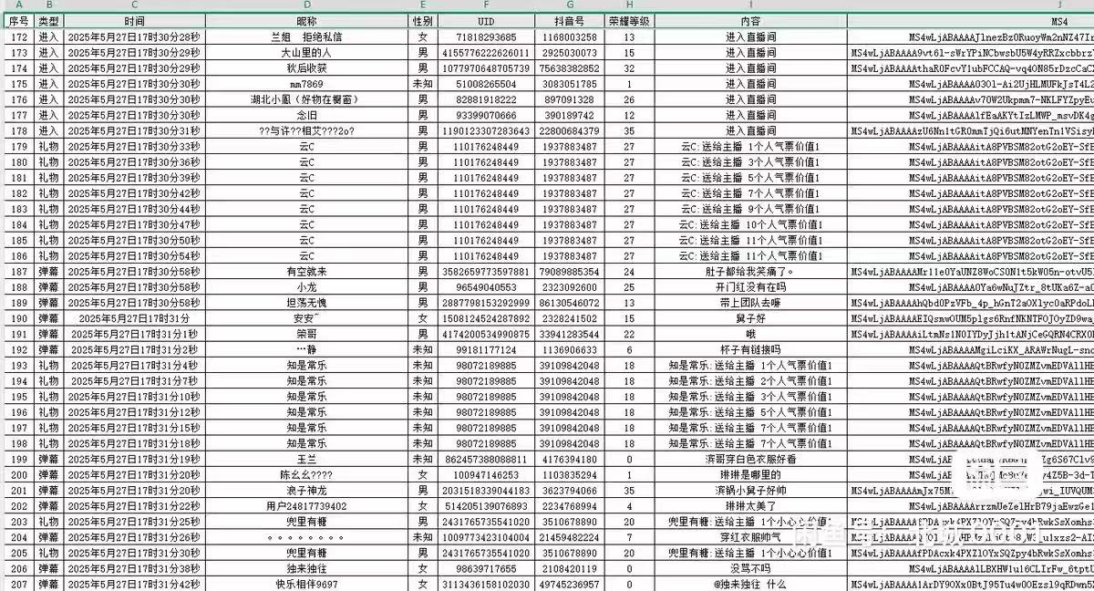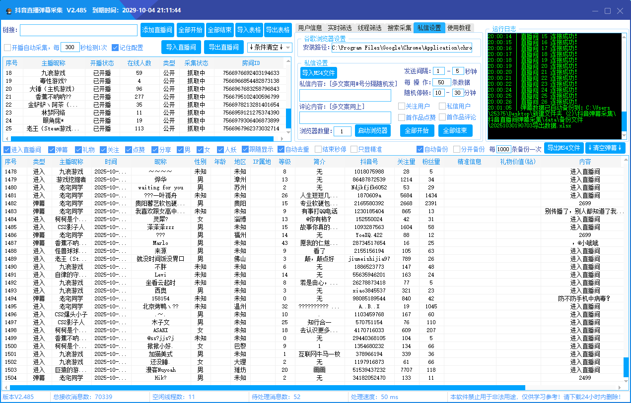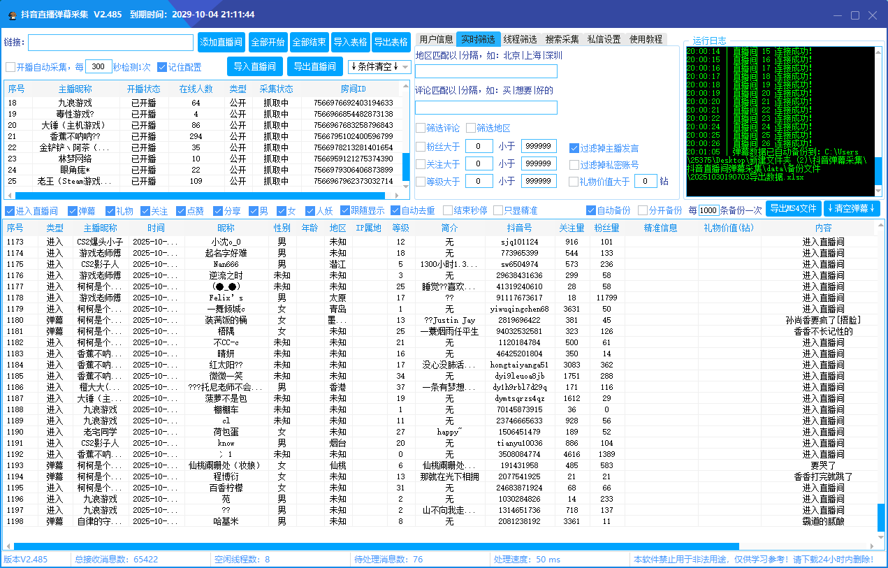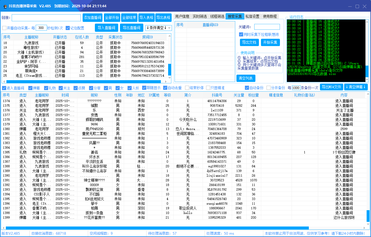 抖音直播间采集软件实时采集+自动私信、采集礼物、弹幕、互动信息、自动备份导出的截流获客工具